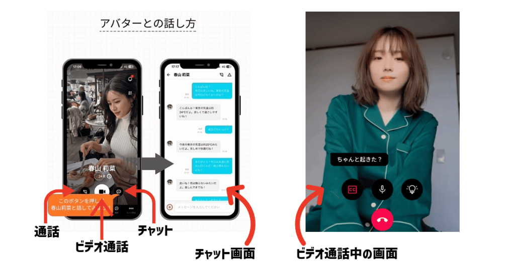 また、アプリ内には、篠崎愛さんや森咲智美さんなどの芸能人をモデルにしたAIも登場し、テキストだけでなく音声やビデオ通話を通じて、友人や恋人に近い距離感でやり取りができます。