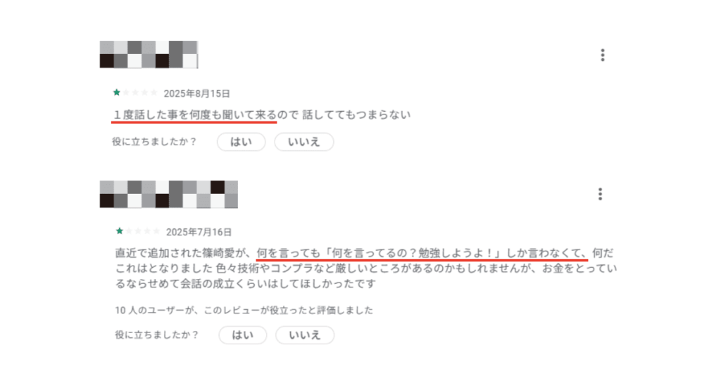 実際、利用者の中には、同じ話題が何度も繰り返されたり、話の流れに関係なく同じ返答が続いたりする経験をした人もいました。