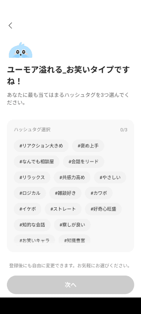 さらに、タイプを選んだあとは自分に当てはまるハッシュタグを選択します。登録後にも変更は可能です。