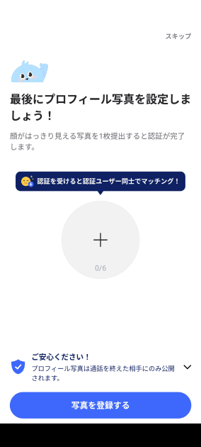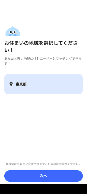 地域と顔写真を登録して終了です。顔写真を登録しなくてもアプリ自体は利用可能ですが、マッチングに時間がかかります。