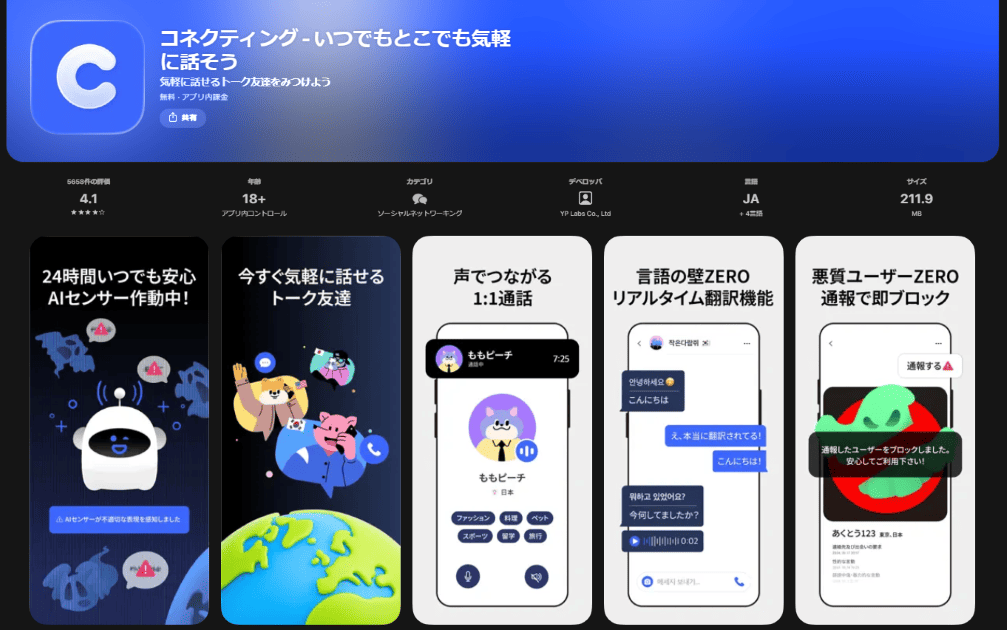 コネクティングは、「YP Labs Co., Ltd」が運営する通話型コミュニティアプリで、ユーザー数は200万人以上を誇ります(2026年2月時点)。