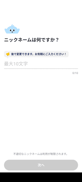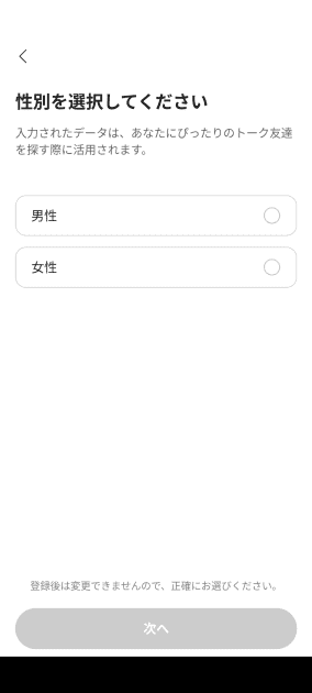 まずは性別と誕生日、ニックネームを登録します。性別と誕生日はあとから修正できないため、間違いのないように入力しましょう。