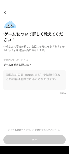 カテゴリを選ぶと、さらに深掘りする質問が出るので詳しく答えましょう。答えることで、会話の参考になる「おすすめトピック」が通話画面に表示されます。