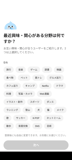 最大6つの趣味や興味のカテゴリを選ぶと、コネクティングのAIが気が合いそうなユーザーを紹介してくれます。