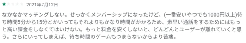 一方で、マッチング時間に課題を抱えており、「すぐに誰かと話したい」「確実に女性と会話したい」という人には不向きな面もあります。