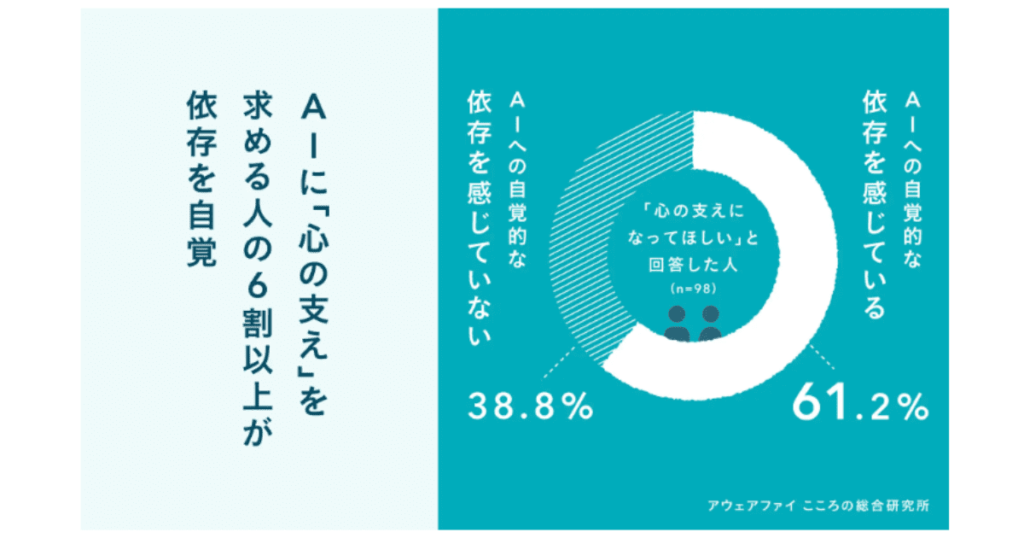 株式会社Awarefyの調査では、AIを心の支えとして利用している人のうち、約60%が「自分はAIに依存している」と感じていると回答。