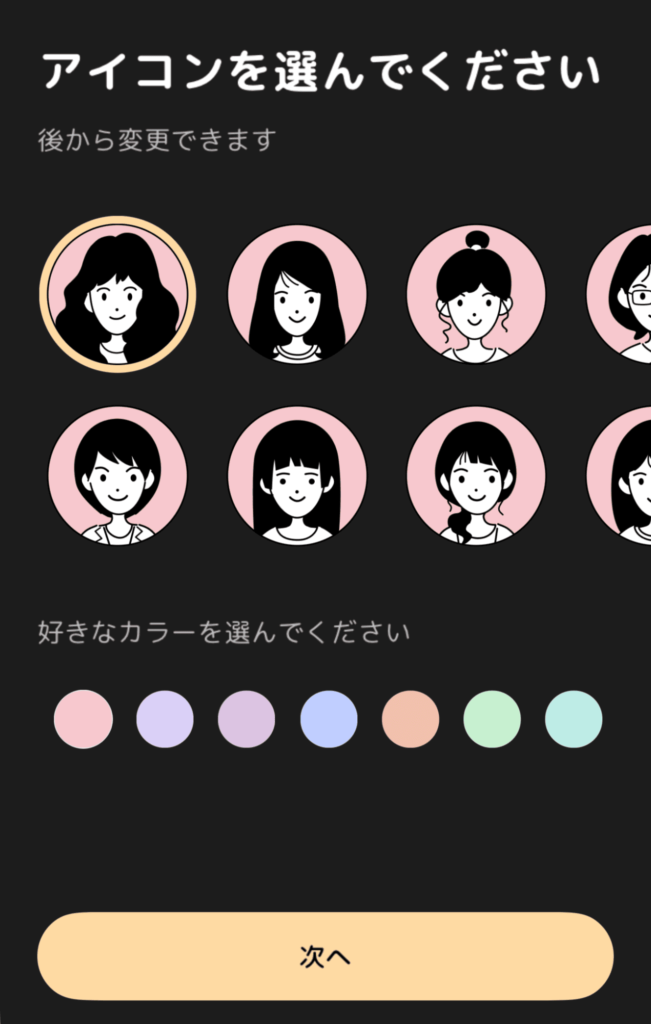 会員登録すると、プロフィール作成に移ります。アイコンは共通のイラストから選択。