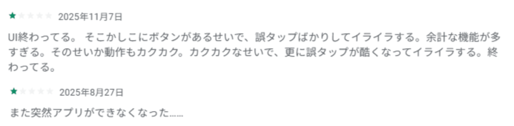 「バグが多い」「ネットワークエラーになる」といった評価も多いです。また、「ログインができない」といったトラブルを訴える声もいくつかありました。