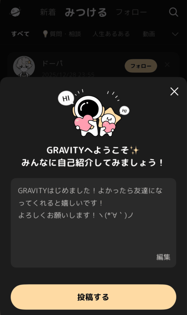 | アプリ名 | GRAVITY(グラビティ)やさしいSNS-暇つぶしチャット |