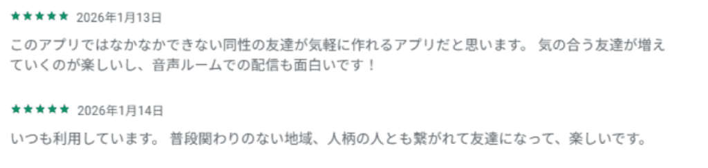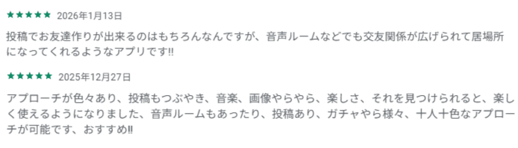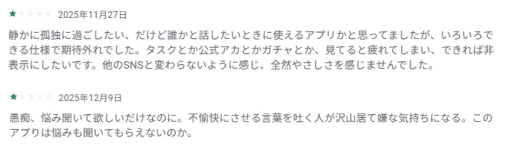 「やさしいSNS」がコンセプトでありながら、実際には「ほかのSNSと変わらない」「不快な言葉を吐く人がいる」「下ネタを書いてくる人がいる」「出会い目的ばかり」といったレビューが多くありました。