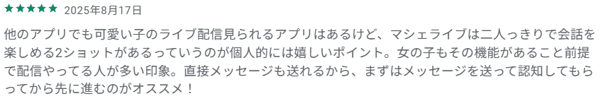 ただし、初対面の女性を前にすると緊張してうまく話せない人も多いもの。いきなり本番に挑むより、マシェライブで会話練習を重ねてから挑戦することをおすすめします。