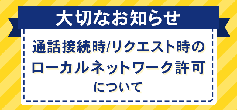 通話接続時または通話リクエスト時ですが、必ず「ローカルネットワーク」の接続許可をしていただくようにお願いいたします。※ビデオ通話に限らず音声通話でも「許可しない」を選択した場合、その後にビデオ通話接続をした際に映像が映らなくなってしまうためご注意ください。