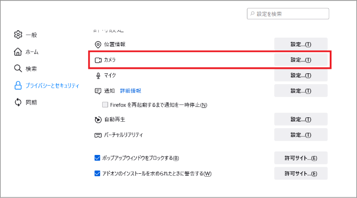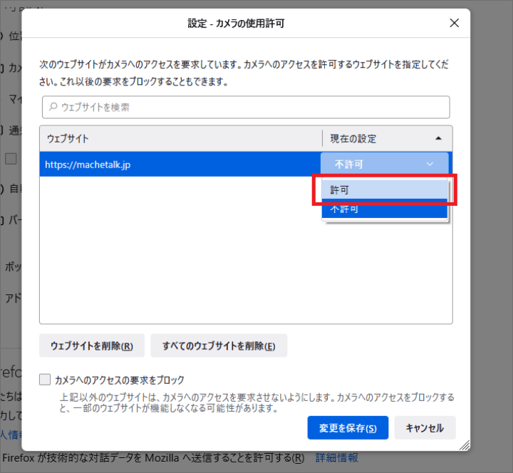 2. 別タブで開かれたページのカメラ、マイクの設定を【ブロック】から【許可】へ変更し、前の画面に戻ると 映像が映ります。